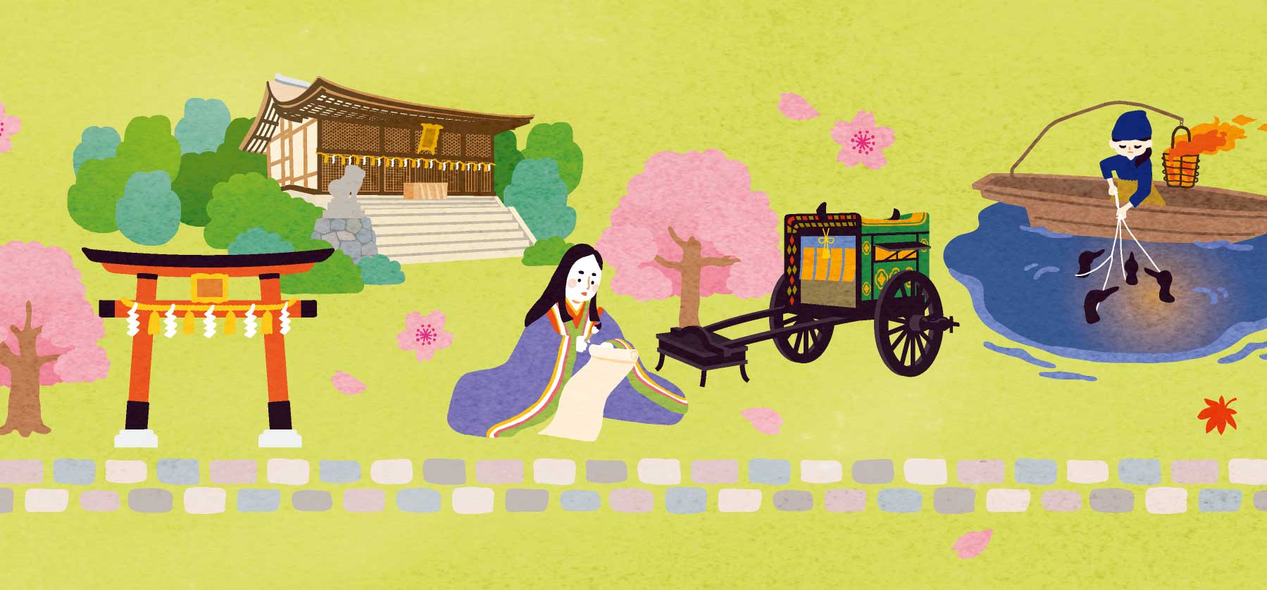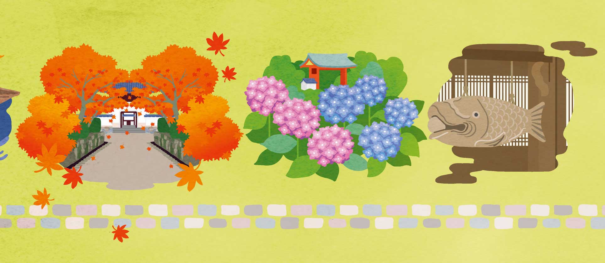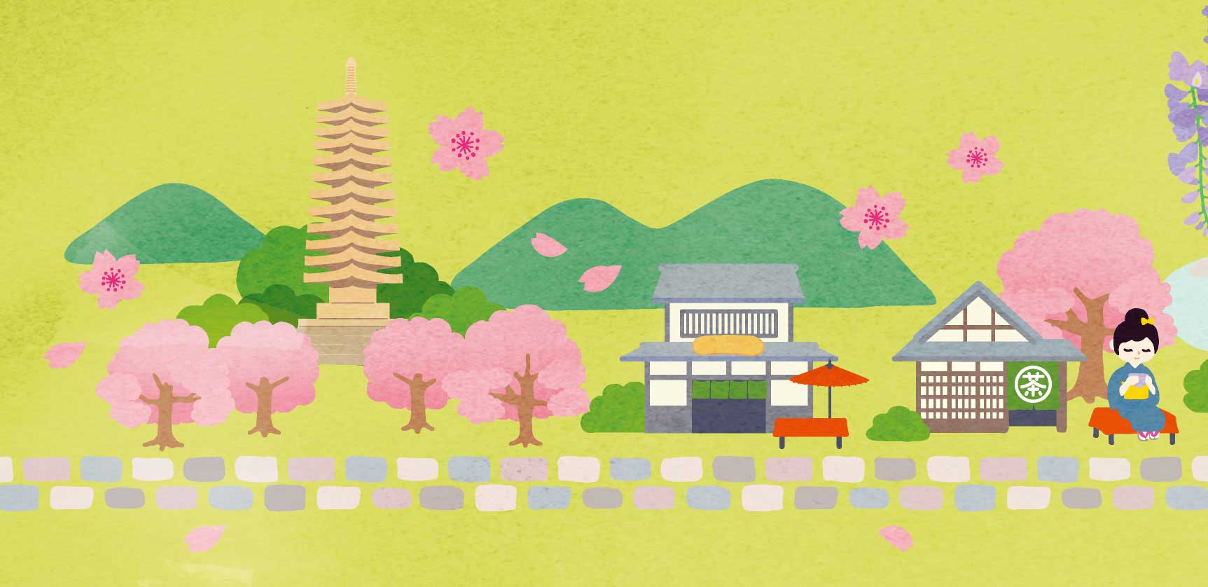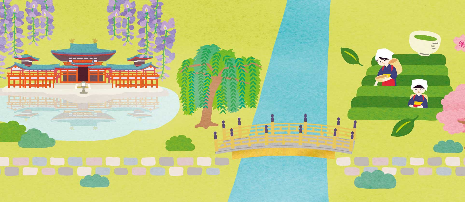 お菓子のパッケージ用に京都府宇治市の観光名所を描きました。